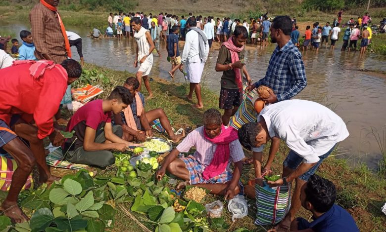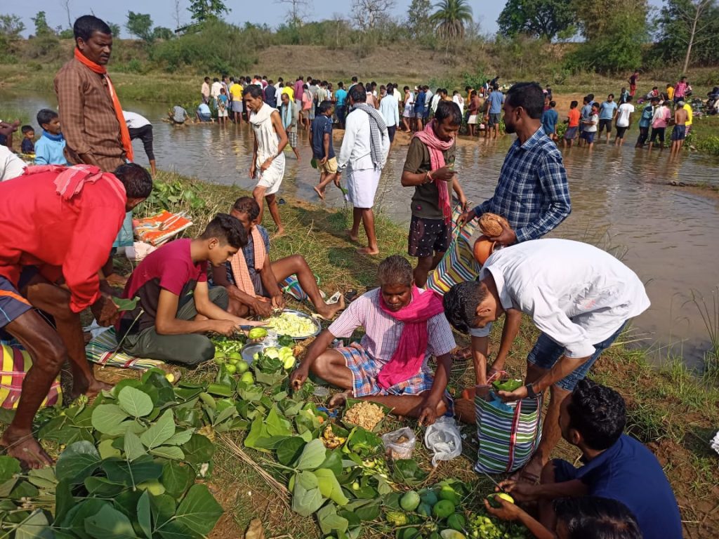 ए चार ठन ढेला के मंडाउन हुनचो उपरे आनलो पानी कुंडी के मंडावसोत।एचो पाछे घरे माईलोगन भात-पेज रांधुन रसोत।ए दिन समदी -सगा,भांचा भचूरा सपाय के नेवता देसोत।घर – घर आमा चो साग आउर दार बोबो बनेसे।आमा संग सुकसी झोर नाहले मछरी बनावसोत।ए दिन के कुकड़ा -बोकड़ा खावतो नोहाय।