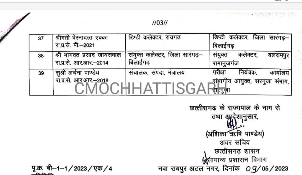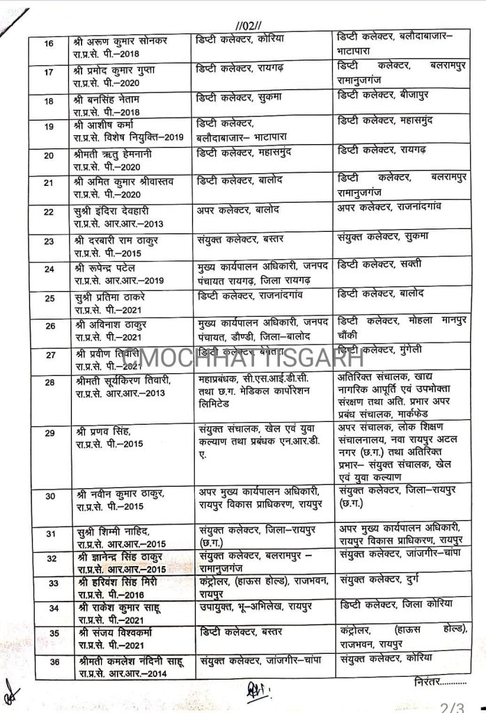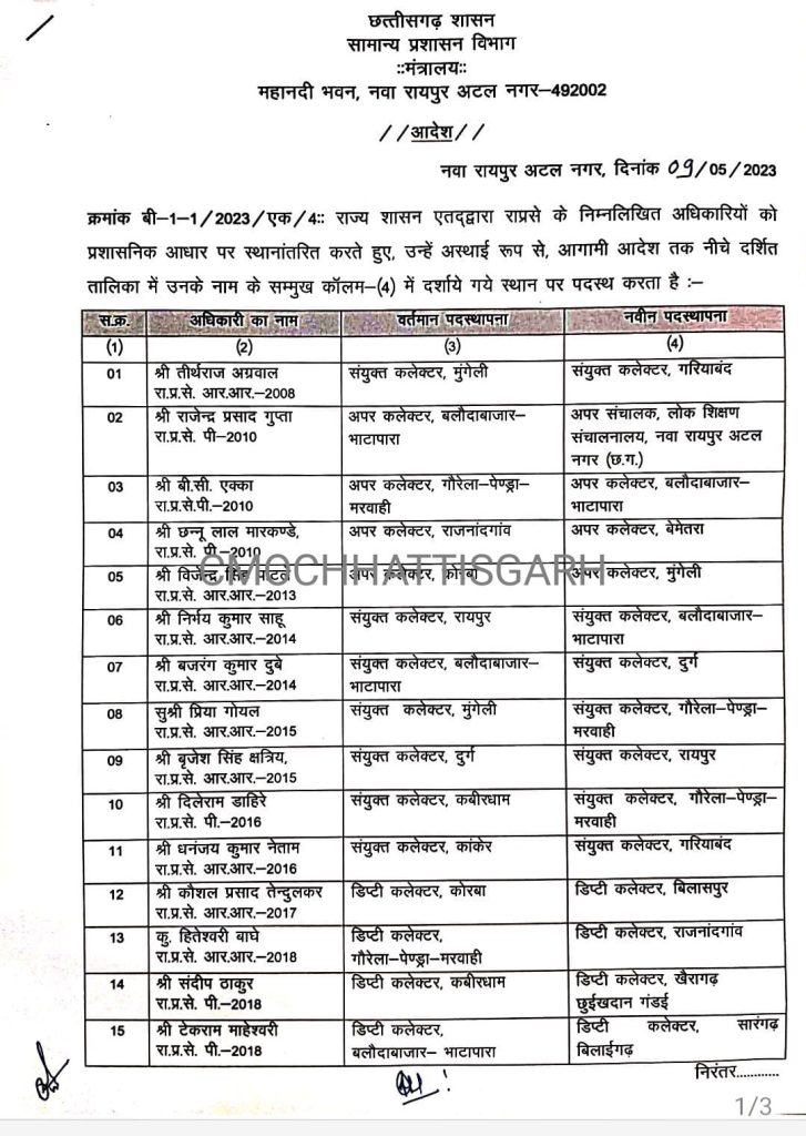 बता दें कि संयुक्त कलेक्टर, अपर कलेक्टर और डिप्टी कलेक्टर लेवल के अधिकारियों का तबादला हुआ है।