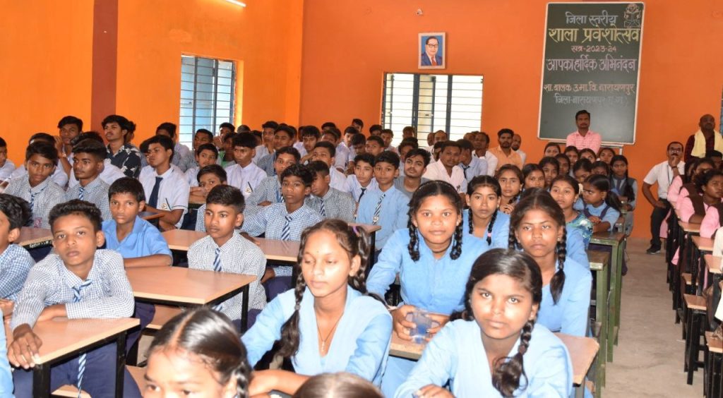 नारायणपुर, 30 जून 2023 – राज्य सरकार के मंशा के अनुरूप जिले भर में शाला प्रवेशोत्सव में उमंग एवं उत्साह से बच्चों का मन प्रफुल्लित हो रहा है। बालक शाला माध्यमिक विद्यालय नारायणपुर में जिला स्तरीय शाला प्रवेशोत्सव विधायक एवं छत्तीसगढ़ हस्तशिल्प विकास बोर्ड के अध्यक्ष श्री चंदन कश्यप के मुख्य आतिथ्य में आयोजित किया गया। उन्होेने कार्यक्रम को संबोधित करते हुए कहा कि बड़े हर्श की बात है विद्यालय प्रारंभ हो चुका है। बच्चें खूब मेहनत कर अपने माता पिता, गांव, जिला तथा राज्य का नाम रोशन करें। शिक्षकों के बताई गई राह पर चलने का प्रयास करें तथा अपना लक्ष्य निर्धारित कर पढ़ाई करें सफलता निश्चित ही मिलेगी। उन्होने कहा कि वास्तविक शिक्षक वही कहलाता है जो वास्तव में प्राथमिक स्कूल में बच्चों को अक्षर ज्ञान से लेकर सभी तरह की ज्ञान सिखाते हैं। बच्चें पढ़ लिख कर अच्छे मुकाम हासिल करें, इसके लिए पढ़ाई को लक्ष्य बनाकर नियमित रूप से पढ़ें। दसवीं एवं बारहवीं के विद्यार्थी आज से ही लक्ष्य निर्धारित कर पढ़ाई करना सुनिश्चित करें, जिससे परीक्षा फल अच्छे श्रेणी में प्राप्त होगा।